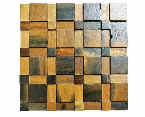Reclaimed wood are often recycled from old fishing boats and old ships. They go through the necessary wood treatment process, cut and then glued to fabric mesh or to a thin layer of plywood, in particular pattern to make beautiful mosaic tiles. Wood mosaic have the charm and character of reclaimed wood. Eye catching works of art, which give beauty to your place.