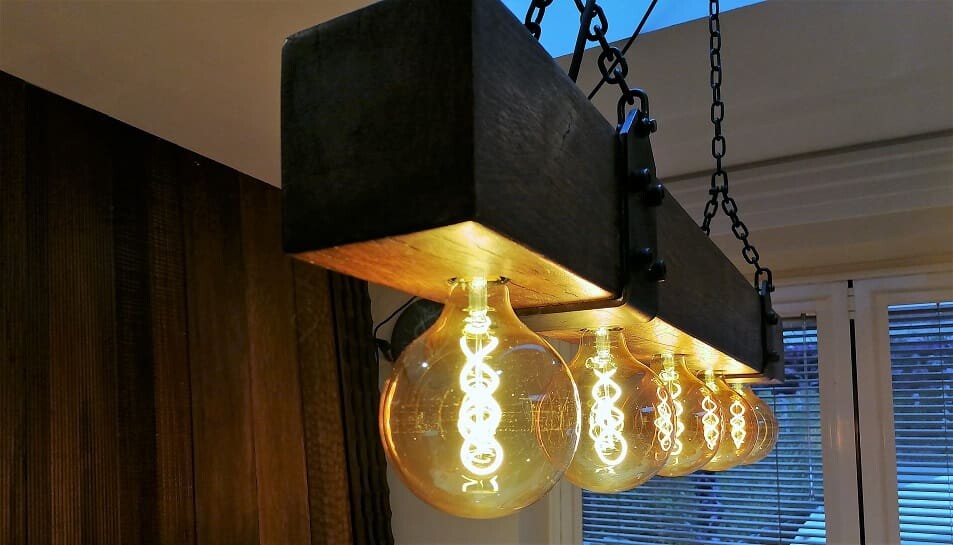 Suspended Wood Beam Lighting, Ceiling Wood Beam Light Fixture. Hanging lights.