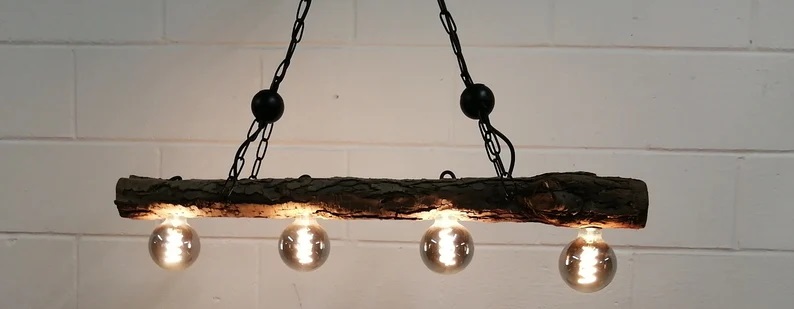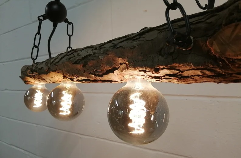 Beautiful Tree Log Suspended Light With 4 Bulb Holders & 4 Smoky Round Bulbs.