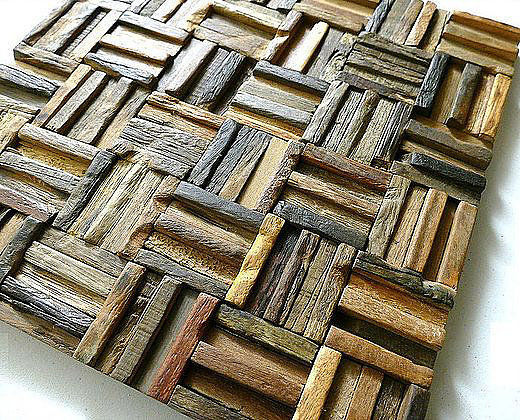 Reclaimed wood are often taken from old fishing boats and old ships. They go through the necessary wood treatment process, cut and then glued to fabric mesh or to a thin layer of plywood, in particular pattern to make beautiful mosaic tiles. Wood mosaic have the charm and character of reclaimed wood. Eye catching works of art, which give beauty to your place.