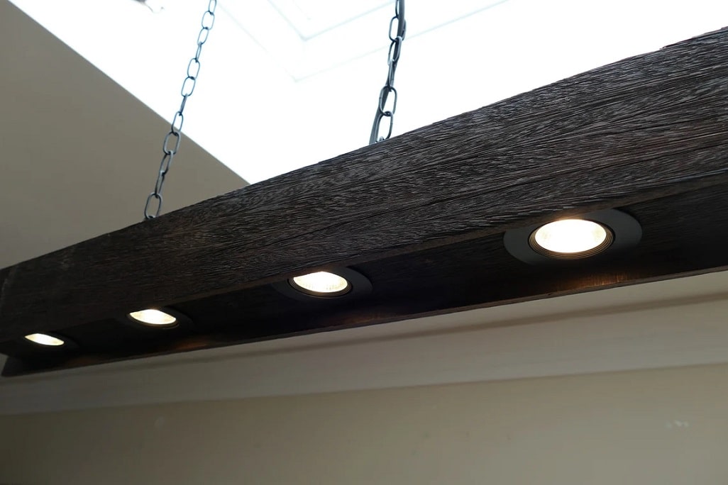 Suspended Rustic Wood Beam Light, Ceiling Wood Beam With 4x LED Spotlights.