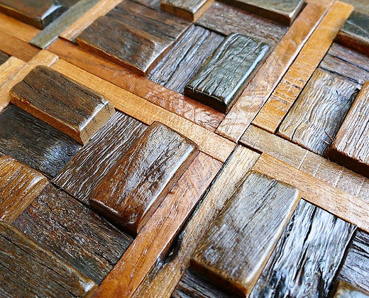 Reclaimed wood are often recycled from old fishing boats and old ships. Then they go through the necessary wood treatment process, cut and then glued to fabric mesh or to a thin layer of plywood, in particular pattern to make beautiful mosaic tiles. Wood mosaic have the charm and character of reclaimed wood. Eye catching works of art, which give beauty to your place.