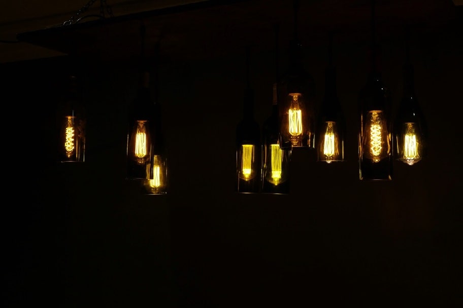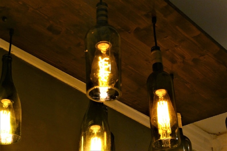 This chandelier has 10 dark colour wine bottles with various shapes and colour