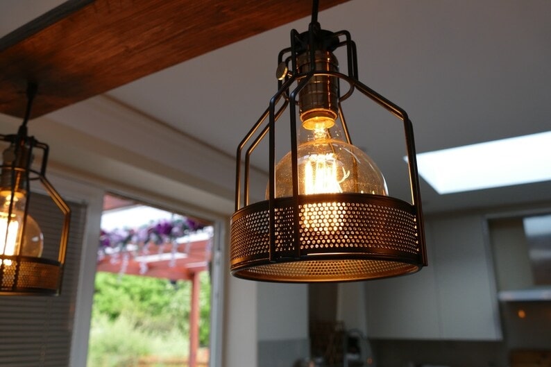 Suspended Reclaimed Wood Timber With 3 Metal Cages And Bulbs.